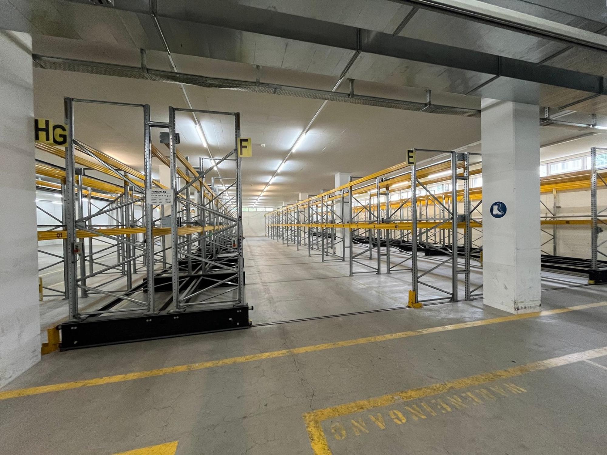 Ein Lager im Untergeschoss (ca. 1000 m2) mit Platz für 1400 Einzelpaletten (Regallager). Ein Warenlift von 4'000 kg Nutzlast unmittelbar bei der Dockingstation gelegen erschliesst die Flächen.
